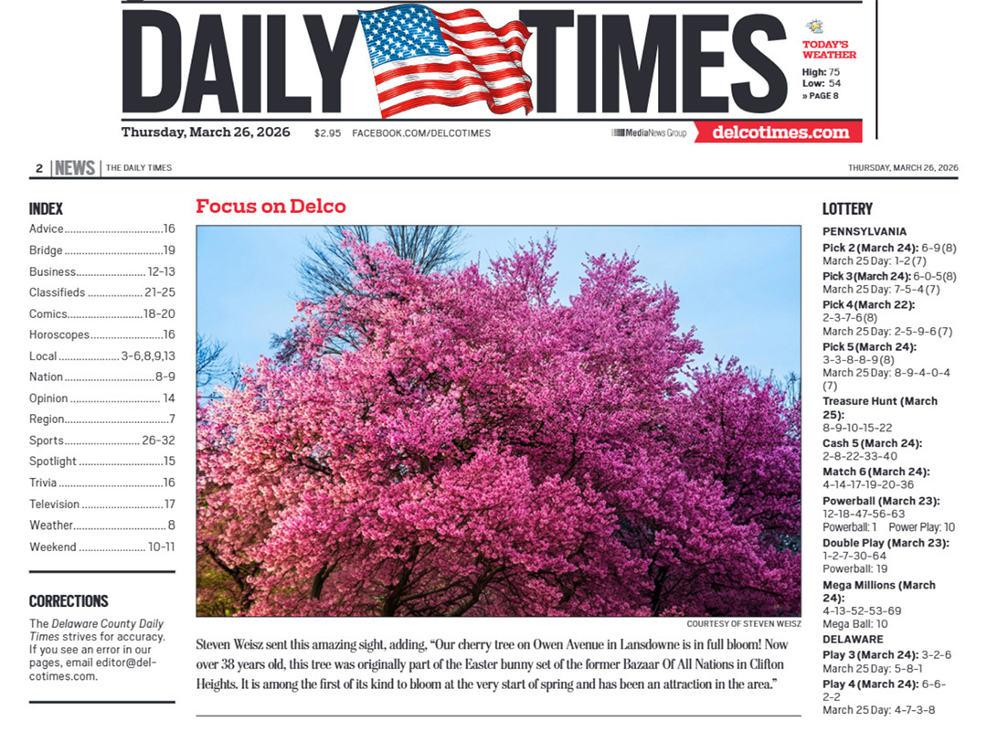 – Image published in print edition of Delaware County Daily Times for cherry blossoms 3-26-2026. | View Image